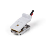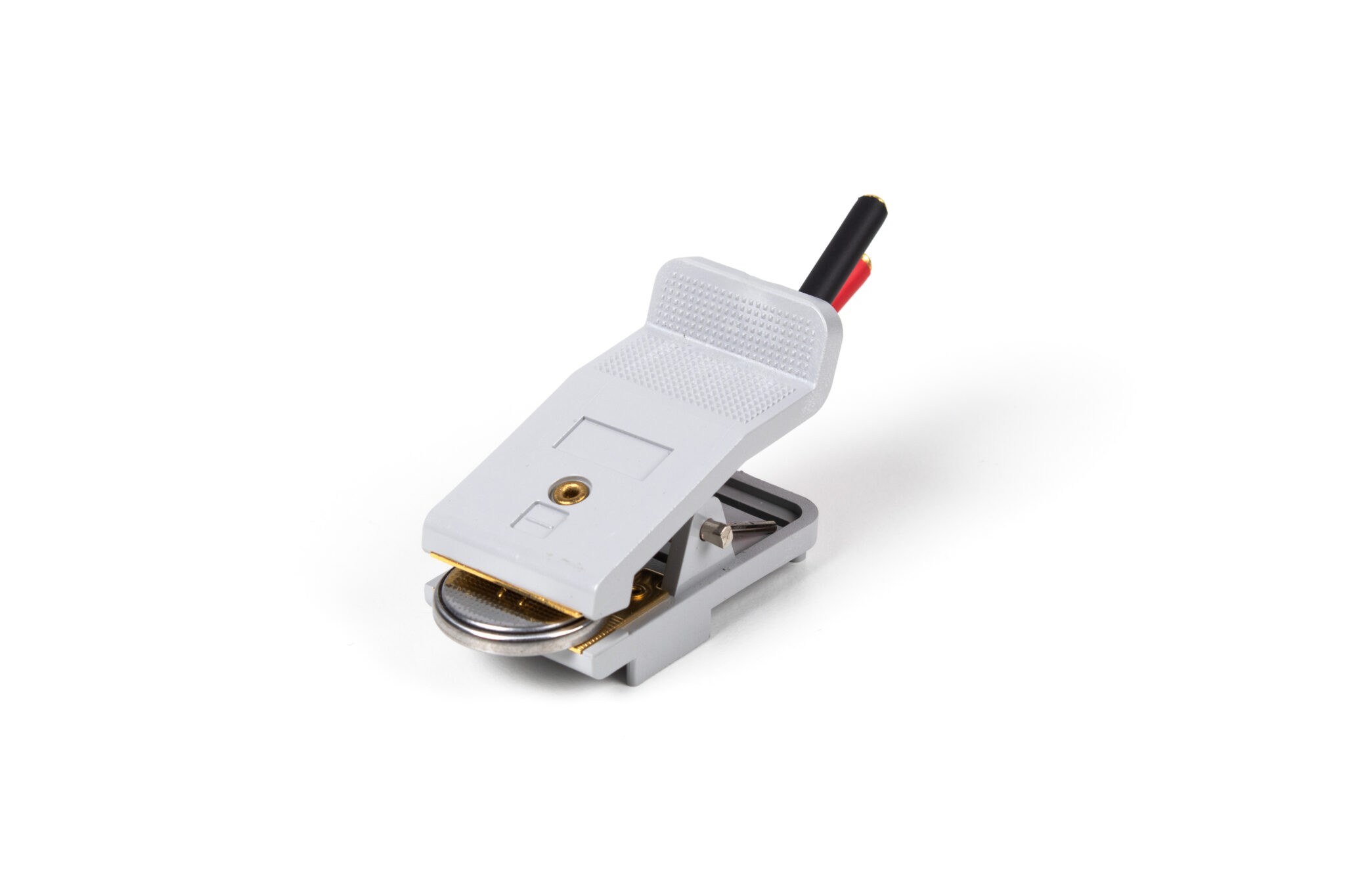 内蔵のバネにより、コイン電池をしっかりと保持します。裏面には黒と赤の 2 mm バナナプラグを備えており、標準の PalmSens センサーケーブルを簡単に接続できます。厚さ 10 mm までのコイン電池に対応しています。